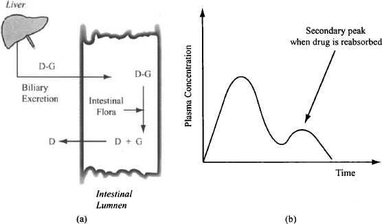 ● 肝肠循环的药物血液浓度与时间的关系呈双峰。