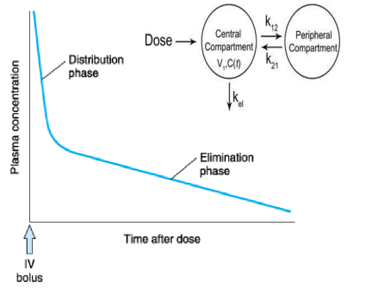 ● 开放性二室模型: 中央室与周边室,药物仅从中央室消除。