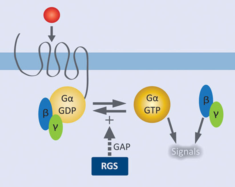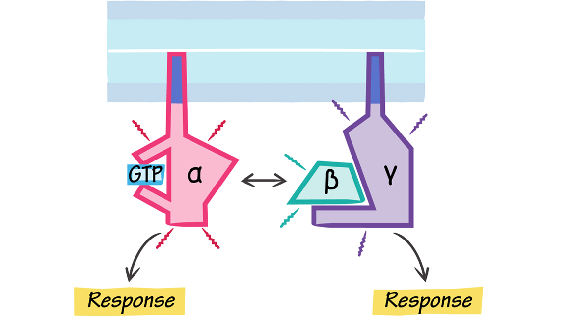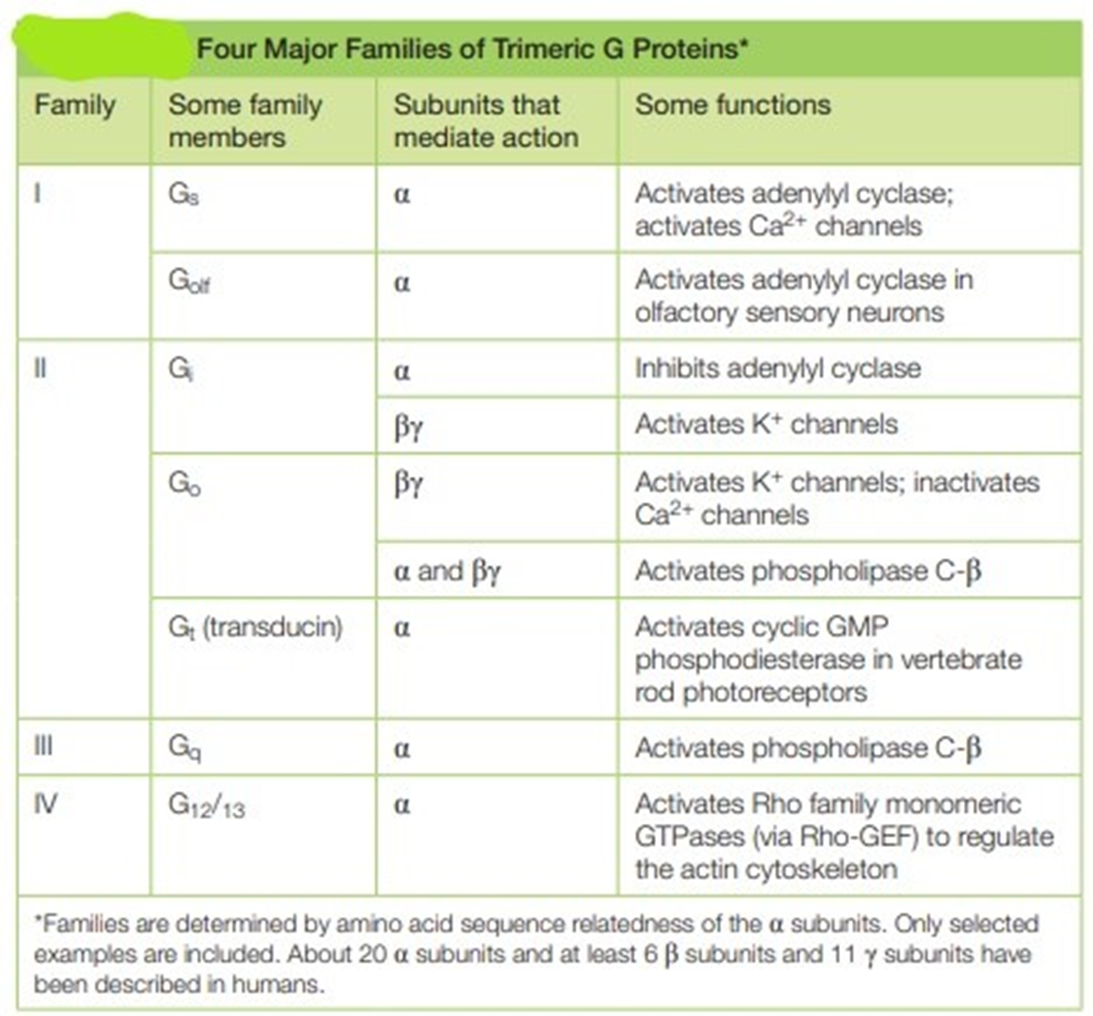 ● G蛋白为胞内信号通路的关键分子,由α, β和γ 亚基组成三聚体。