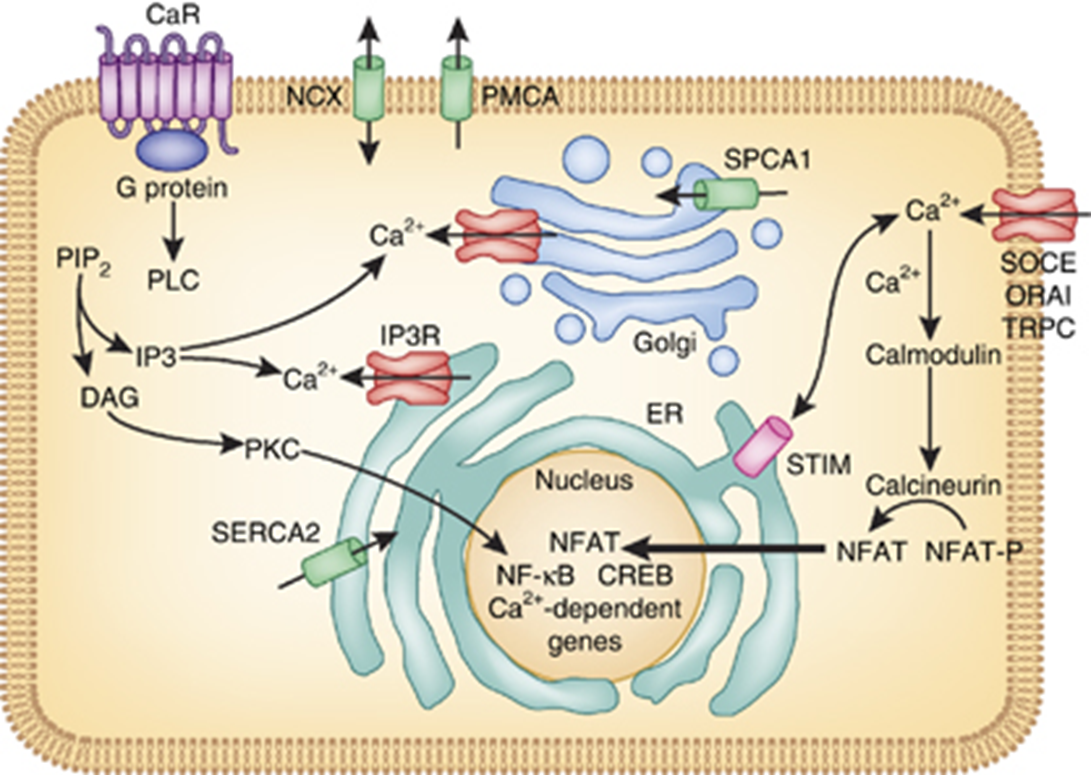 ● 可与钙调蛋白 (calmodulin, CaM) 结合,激活Ca2+-CaM依赖性蛋白激酶 (CaMK)、钙调磷酸酶(calcineurin)等,产生广泛的生物学效应。