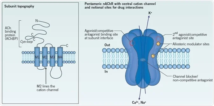 ● Cys-环受体类:5聚体围成中央离子通道;每个亚基4TM;N或C-端位于膜外;胞外结构域,每隔15个残基,存在一个Cys,形成Cys-环;配体来自胞外。代表性受体:nAChR, 5-HT3R, GABAAR, GlyR。