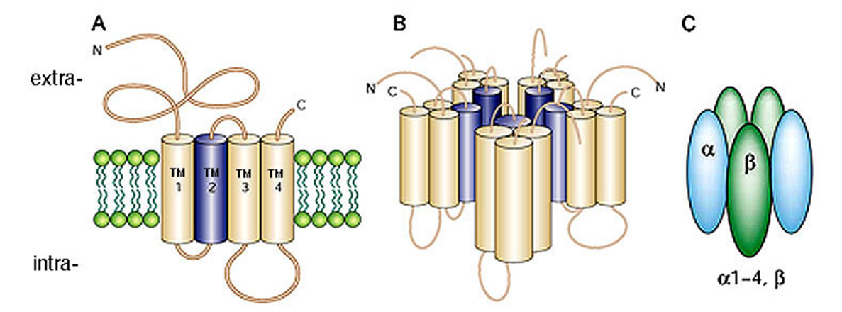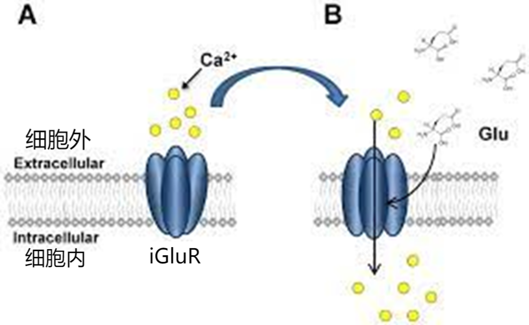 配体为胞外的谷氨酸(Glu); 非选择性阳离子通道,但NMDAR对钙离子通透性较高; 4个亚基; N-端胞外,C-端胞内。