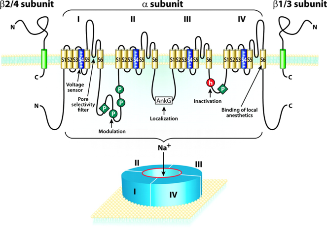● 药物结合于α亚基的第IV区S6区段的残基。