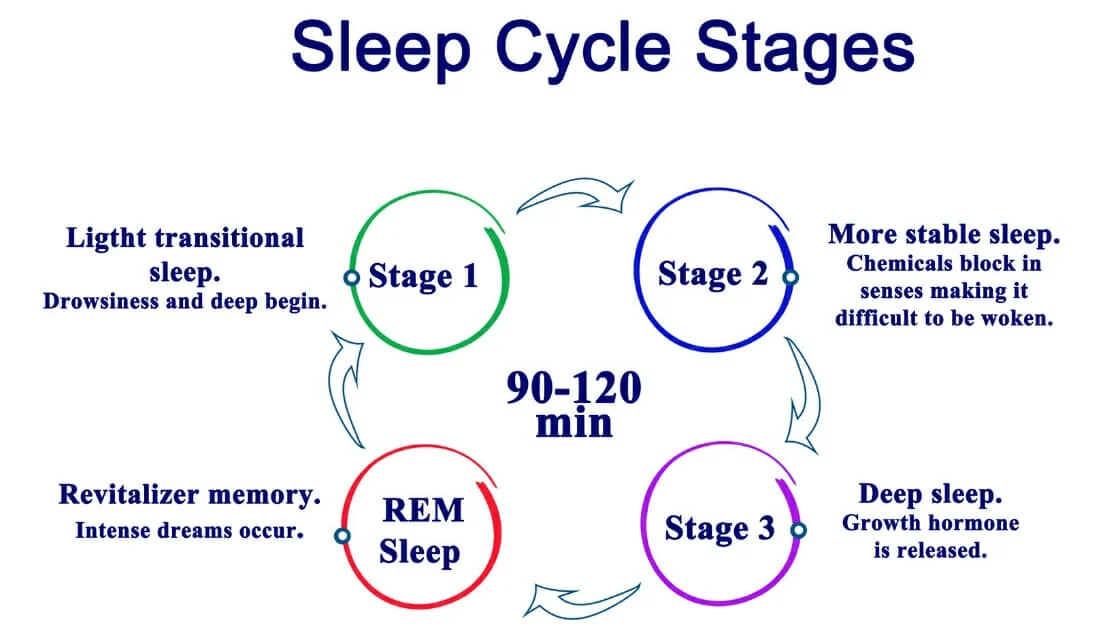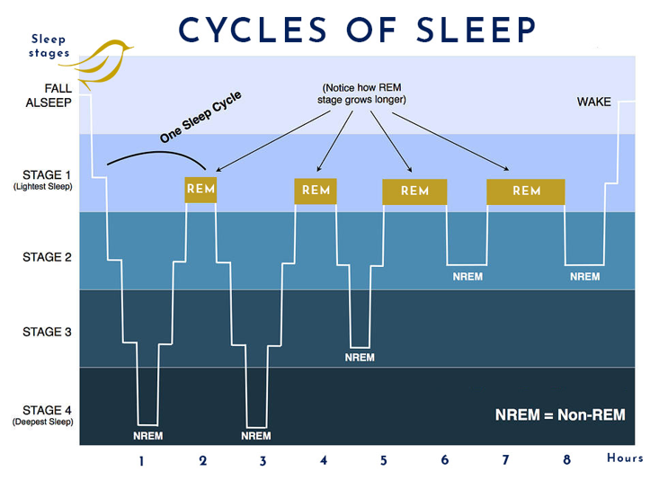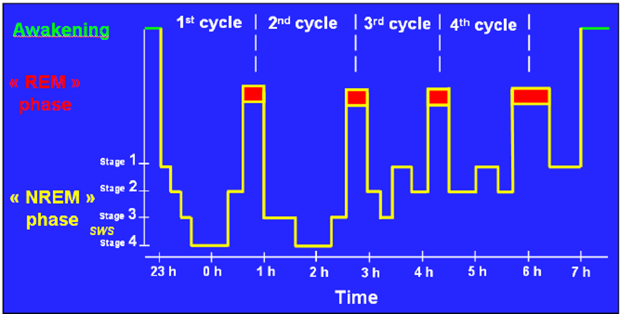 ● 两者循环交替,前半夜以NREMS为主;后半夜REMS增多。
