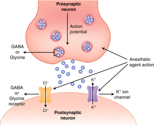 1、吸入麻醉药与部分静脉药 (丙泊酚、咪达唑仑、依托咪酯): 激活GABAA受体,促进氯离子通道开放,增加氯离子内流,引起细胞膜超极化,从而使中枢抑制。