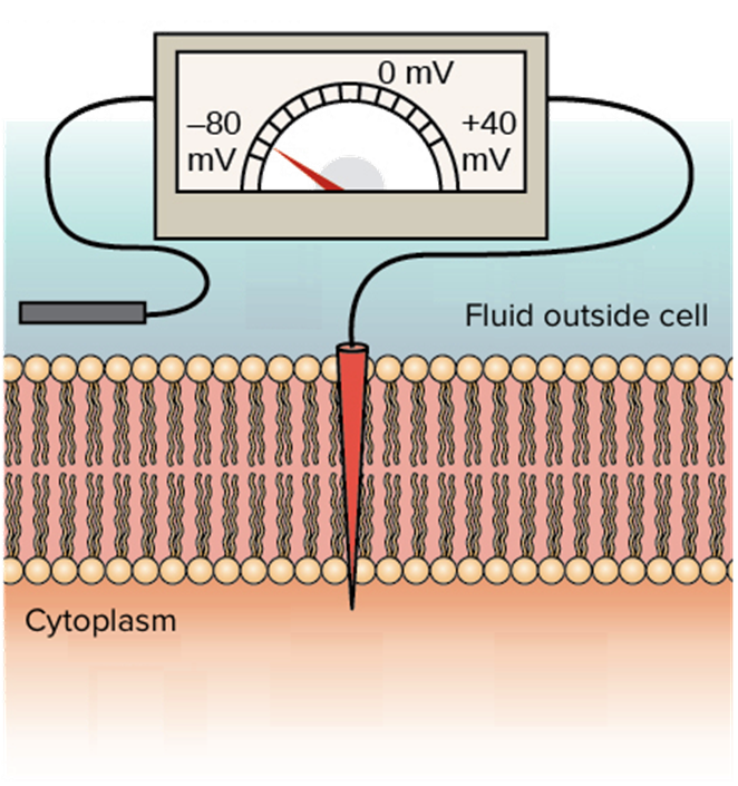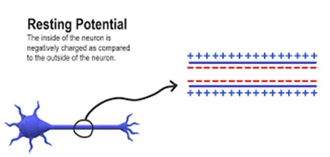 未受刺激时膜内外电位差(稳态)。神经元静息电位在-30 ⁓ -90 mV之间。外正内负。
