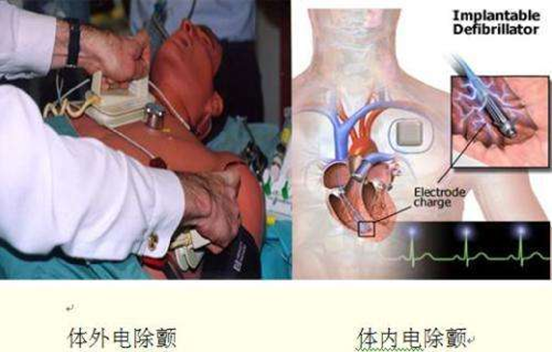 ● 严重心律失常时,用短暂高压强电流通过心脏,使全部或大部分心肌细胞在瞬间同时除极,造成心脏短暂的电活动停止,然后重新主导心脏节律的治疗过程。