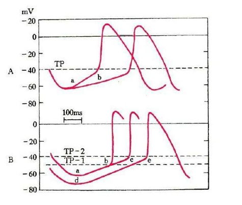 A:速度由a到b时,自律性下降 B:最大复极电位由a到d,或阀电位由TP-1升至TP-2时,自律性降低。 |