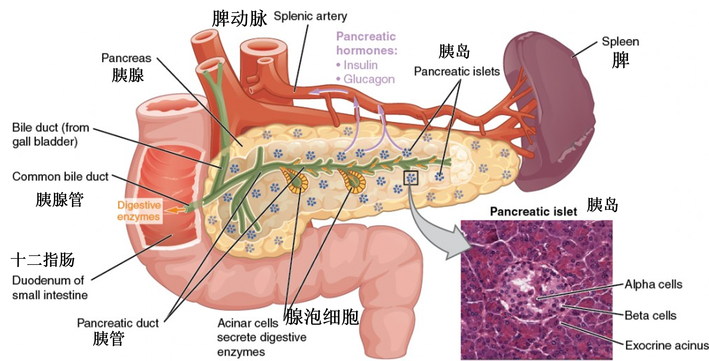 ● 外分泌腺由腺泡和腺管组成,腺泡分泌胰液,腺管是胰液排出的通道。
