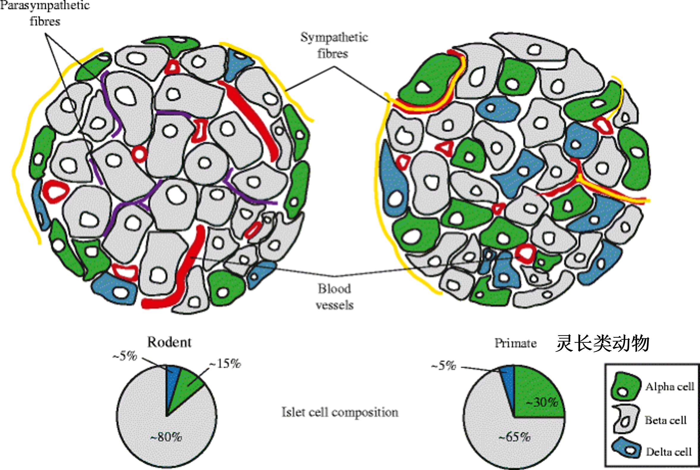 ● 主要由4种细胞组成:α(A)细胞、β(B)细胞、δ(D)细胞、PP(F)细胞。