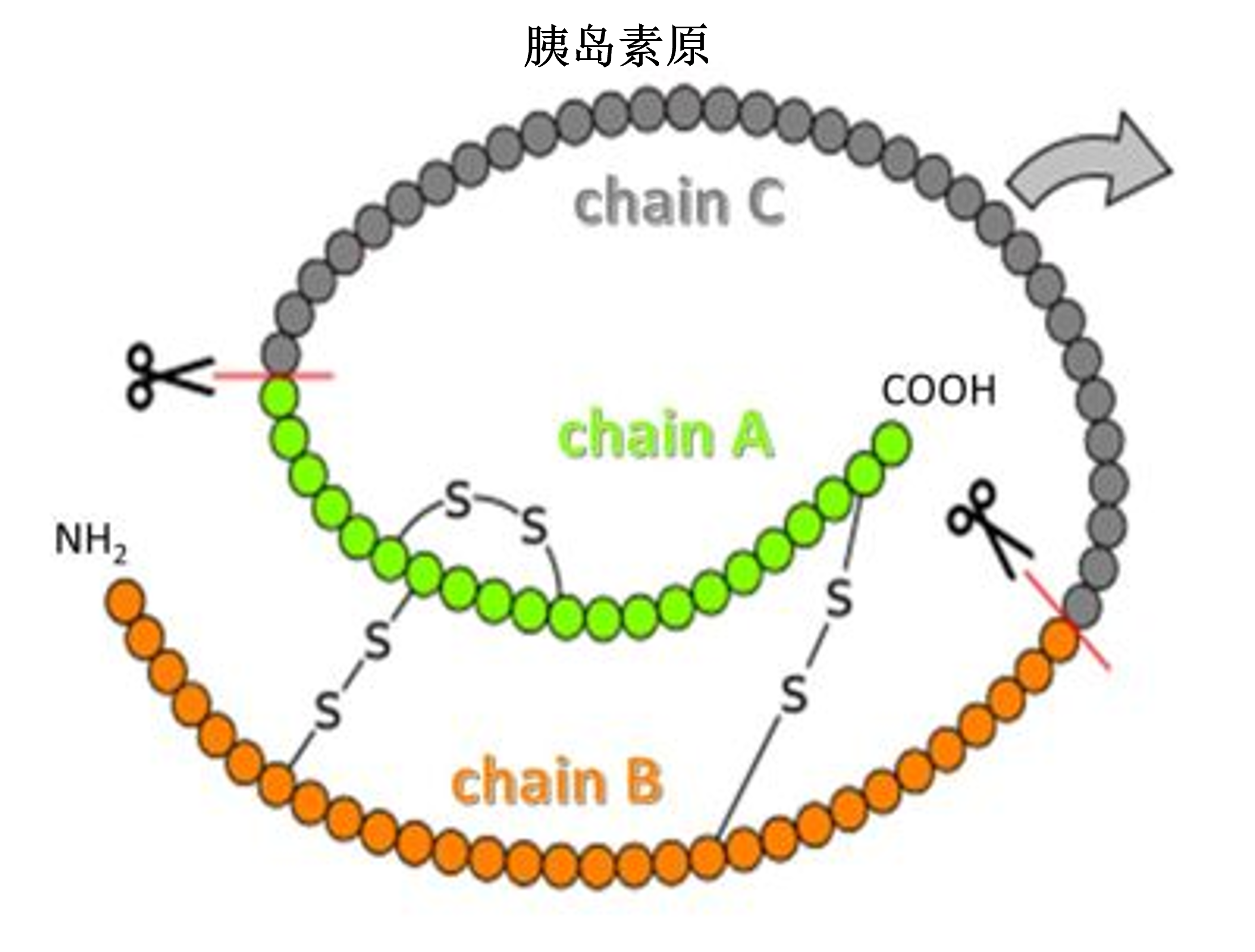 ● 在β细胞中,胰岛素原为86个氨基酸构成的肽链。